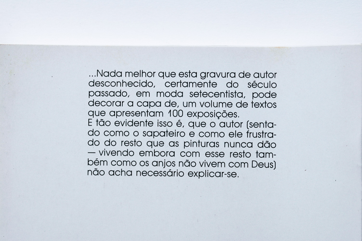 Nada melhor que esta gravura de autor desconhecido, certamente do século passado, em moda setecentista, pode decorar a capa de, um volume de textos que apresentam 100 exposições. E tão evidente isso é, que o autor ( sentado como o sapateiro e como ele frustrado do resto que as pinturas nunca dão – vivendo embora com esse resto também como os anjos não vivem com Deus ) não acha necessário explicar-se.