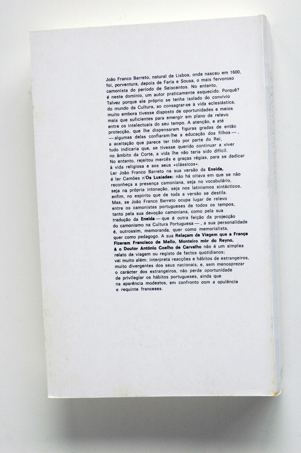 João Franco Barreto, natural de Lisboa, onde nasceu em 1600, foi, porventura, depois de Faria e Sousa, o mais fervoroso camonista do periodo de Seiscentos. No entanto, é neste domínio, um autor praticamente esquecido. Porquê? Talvez porque ele próprio se tenha isolado do convivio do mundo da Cultura, ao consagra-se à vida eclesiástica, muito embora se tivesse disposto de oportunidades e meios mais que suficientes para emergir em plano de relevo entre os intelectuais do seu tempo. A atenção, e até protecção, que lhe dispensaram figuras gradas de então algumas delas confiaram-lhe a educação dos filhos , a aceitação que parece ter tido por parte do Rei, tudo indicaria que, se tivesse querido continuar a viver no âmbito da Corte, a vida não lhe teria sido difícil. No entanto, rejeitou mercês e graças régias, para se dedicar à vida religiosa e aos seus «clássicos». Ler João Franco Barreto na sua versão da Eneida, é ler Camões n’Os Lusíadas: não há oitava em que se não reconheça a presença camoniana, seja no vocabulário, seja na própria intonação, seja nos latinismos sintácticos, enfim, no espirito que de toda a versão se destila. Mas, se João Franco Barreto ocupa lugar de relevo entre os camonistas portugueses de todos os tempos, tanto pela sua devoção camoniana, como pela sua tradução da Eneida que á outra feição da projecção do camonismo na Cultura Portuguesa , a sua personalidade é, outrossim, memoranda, quer como memorialista, quer como pedagogo. A sua Relaçam da Viagem que a França Fizeram Francisco de Mello, Monteiro mòr do Reyno, & o Doutor António Coelho de Carvalho não é um simples relato de viagem ou registo de factos quotidianos: vai muito além: interpreta reacções e hábitos de estrangeiros, muito divergentes nos seus nacionais, e, sem menosprezar o carácter dos estrangeiros, não perde oportunidade de privilegiar os hábitos portugueses, ainda que aparência modestos, ern confronto com opulência e requinte franceses.