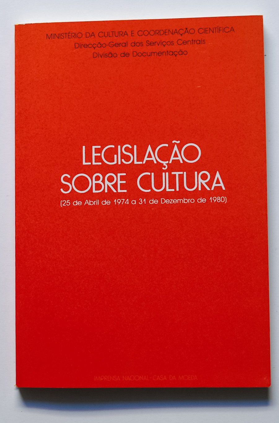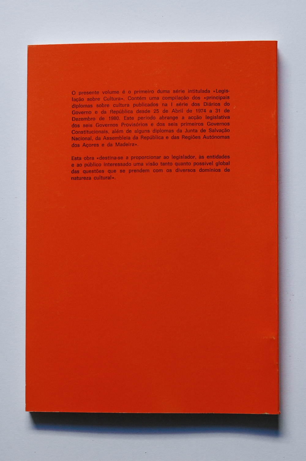 O presente volume é o primeiro duma série intitulada « Legislação sobre Cultura ». Contém uma compilação dos « principais diplomas sobre cultura publicados na I série dos Diários do Governo e da República desde 25 de Abril de 1974 a 31 de Dezembro de 1980. Este período abrange a ação legislativa dos seus Governos Provisórios e dos seis primeiros Governos Constituicionais, além de alguns diplomas da Junta de Salvação Nacional, da Assemnbleia e das Regiões Autónomas dos Açores e da Madeira ».. Esta obra « destina-se a proporcionar ao legislador, às entidades e ao público interessado uma visão tanto quanto possível global das questões que se prendem com os diversos domínios de natureza cultural ».