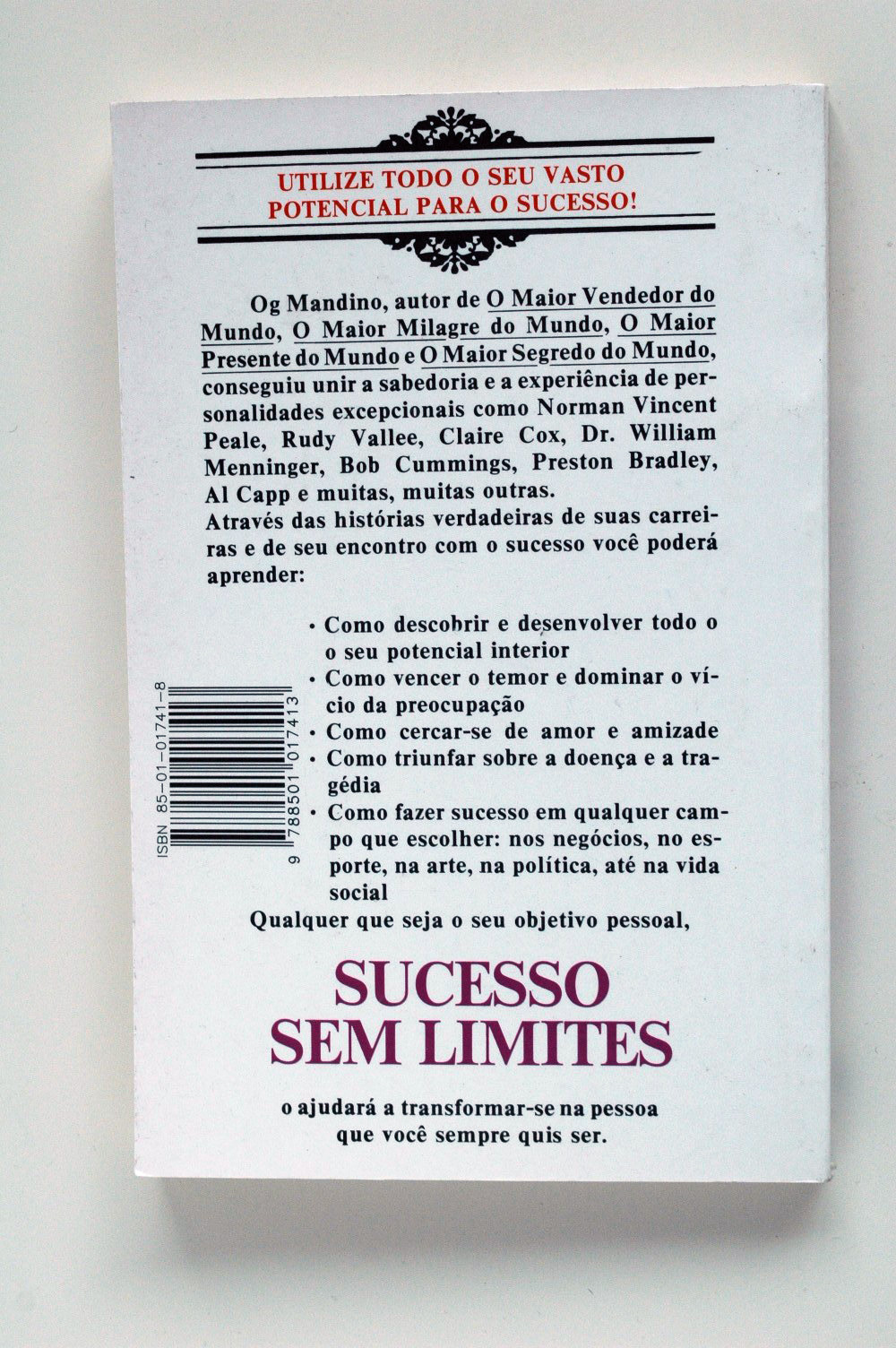 Og Mandino, autor de O Maior Vendedor do Mundo, O Maior Milagre do Mundo, O Maior Presente do Mundo e O Maior Segredo do Mundo, conseguiu unir a sabedoria e a experiência de personalidades excepcionais como Norman Vincent Peale, Rudy Vallee, Claire Cox, Dr. William Menninger, Bob Cummings, Preston Bradley, Al Capp e muitas, muitas outras. Através das histórias verdadeiras de suas carreiras e de seu encontro com o sucesso você poderá aprender: